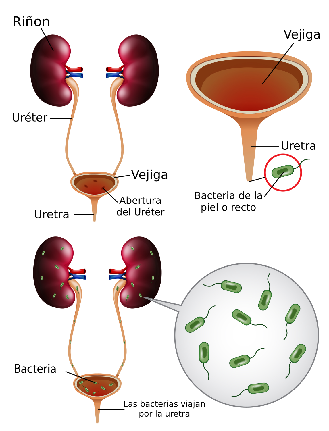 Se produce principalmente por bacterias, la más común es la llamada E. coli que se encuentra principalmente en el colon. La infección suele suceder con las bacterias ingresando al organismo por la uretra, hasta llegar al riñón.